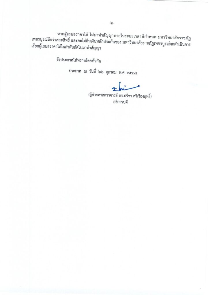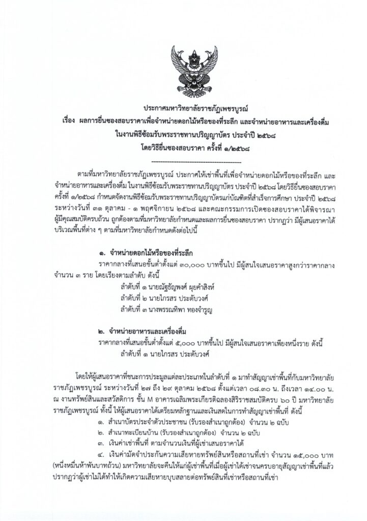 ประกาศมหาวิทยาลัยราชภัฏเพชรบูรณ์ เรื่อง ผลการยื่นซองสอบราคาเพื่อจำหน่ายดอกไม้หรือของที่ระลึก และจำหน่ายอาหารและเครื่องดื่ม ในงานพิธีซ้อมรับพระราชทานปริญญาบัตร ประจำปี 2568 โดยวิธีการยื่นสอบราคา ครั้งที่ ๑/๑๕๖๘